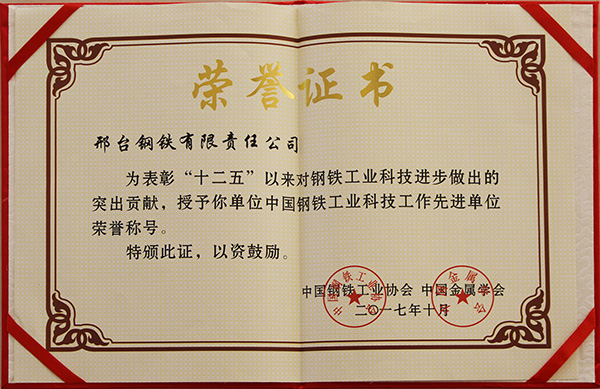 Xingtai Steel was awarded "The Advanced Company of Scientific and Technological Work during Twelfth Five-Year Plan", which was given jointly by CISA (China Iron and Steel Industry Association) and CSM (Chinese Society for Metals).