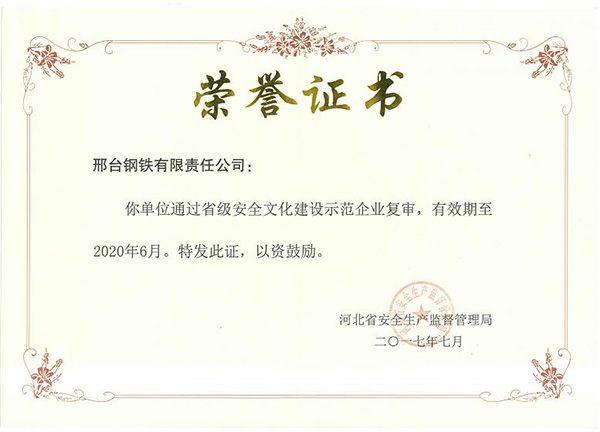 In 2014, initial results had been achieved in safety culture construction of Xingtai Steel, and Xingtai Steel became one of the first enterprises awarded the title of "Provincial Demonstration Enterprise of Safety Culture Construction”. In July 2017, Xingtai Steel passed the assessment and won the title again.