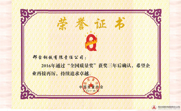 Xingtai Steel won the National Quality Award in 2013. After that Xingtai Steel continually practise the criteria for performance excellence and deeply promote Excellence performance management pattern. Xingtai steel continually pursue excellence by continue improvement. Organized by the leading team of National Quality Award Auditing Activity, the experts of China Quality Association conduct the site confirmation to Xingtai Steel after three years awarded. Xingtai Steel passed the reconfirmation and get the certification after questioning, reporting and site visiting.