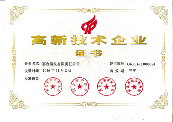Xingtai Steel was named as "High-tech Enterprise" of Hebei Province. This is the second time after awarded in 2013.