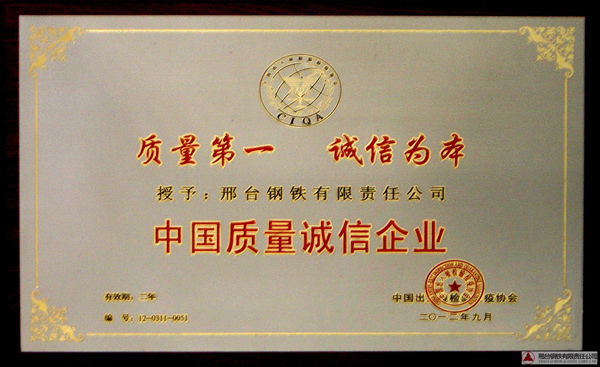 Xingtai Steel was awarded the Quality Credit Enterprise by CHINA ENTRY-EXIT INSPECTION AND QUARANTINE ASSOCIATION.