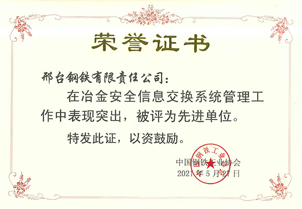 Xing Steel was awarded as an advanced unit for its outstanding performance in the management of metallurgical safety information exchange system.